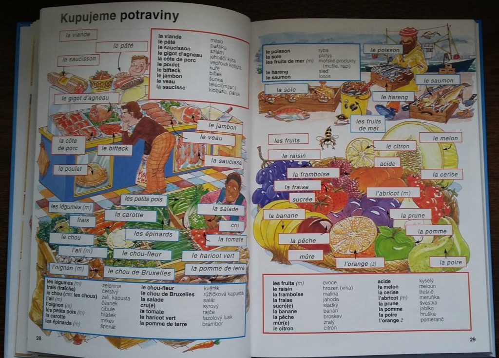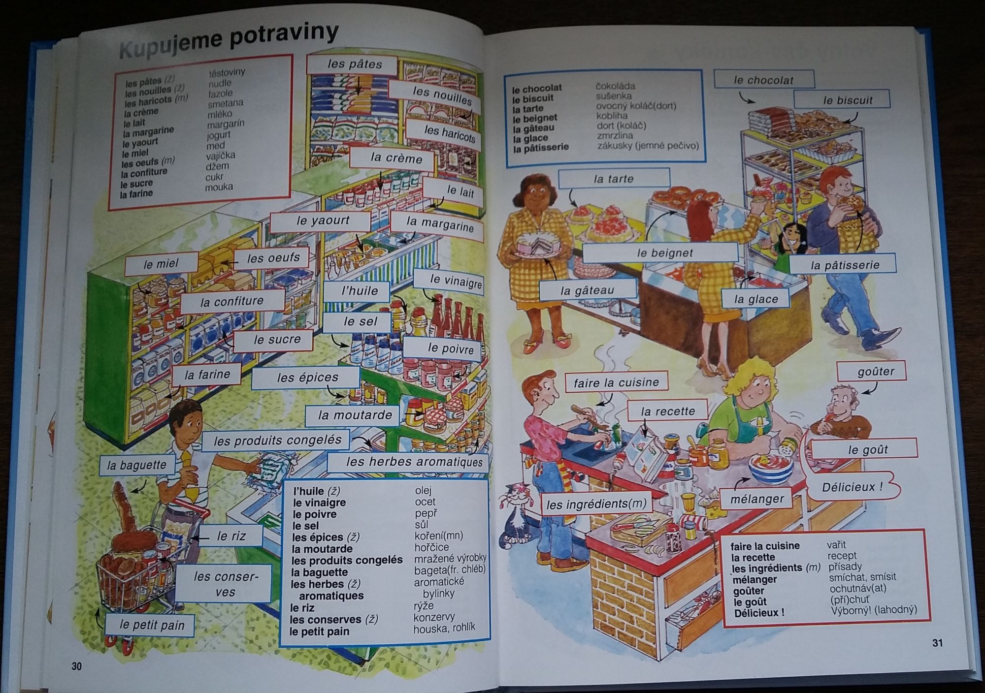 Pro novou slovní zásobu vyzkoušejte třeba obrázkový slovník. Já mám moc ráda tento: Obrázkový francouzsko-český slovník, H. Davies/J. Priesolová, 1995, FRAUS. Vřele ho doporučuji. Je tam vždy celá dvoustrana věnovaná určitému tématu – tedy velký obrázek s detaily a u nich jsou francouzské názvy. Pak je tam vždy tabulka s překladem. Podívejte se na stránky věnované vaření a potravinám: